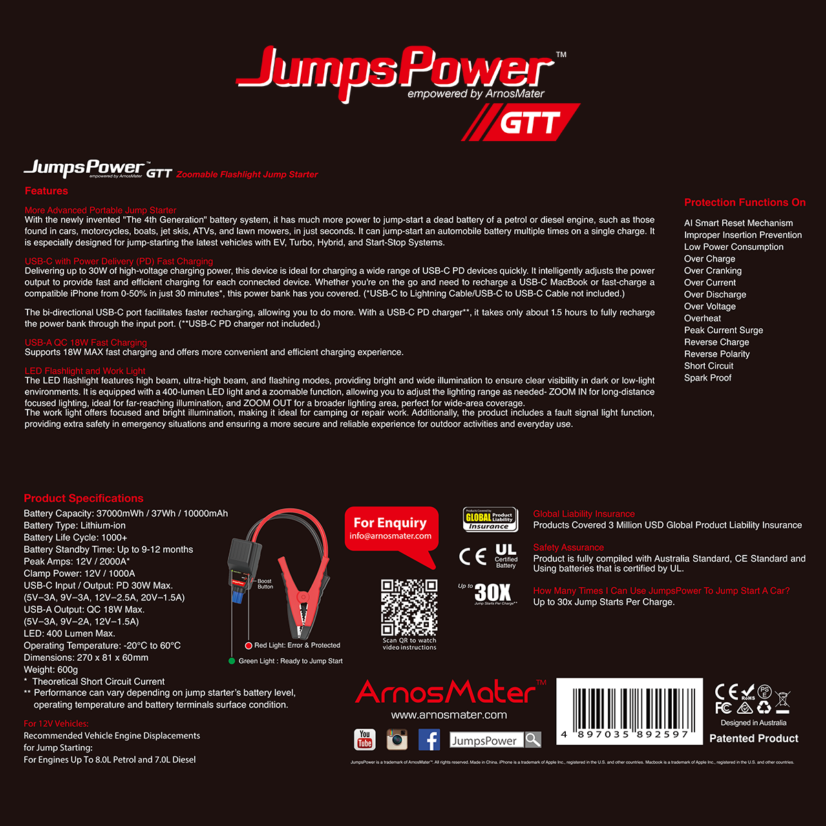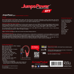 With the newly invented “The 4th Generation” battery system, it has much more power to jump-start a dead battery of a petrol or diesel engine, such as those found in cars, motorcycles, boats, jet skis, ATVs, and lawn mowers, in just seconds. It can jump-start an automobile battery multiple times on a single charge. It is especially designed for jump-starting the latest vehicles with EV, Turbo, Hybrid, and Start-Stop Systems.